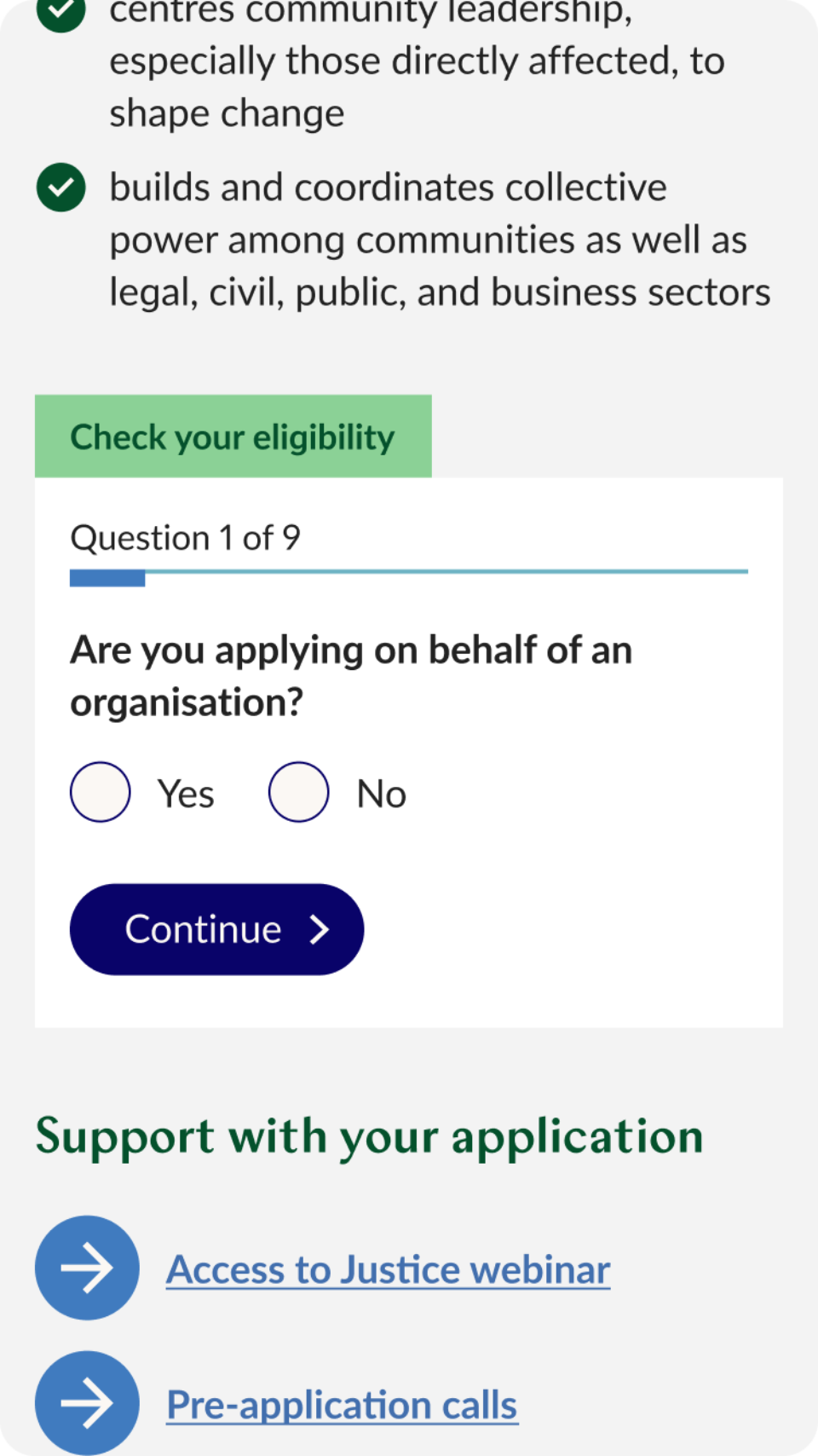 Building on our previous work together, we collaborated with the funding and marketing teams to create a refreshed user journey for their new funding strategy. The latest version of the site includes a user-friendly eligibility checker and a transparent process for applying for funding.