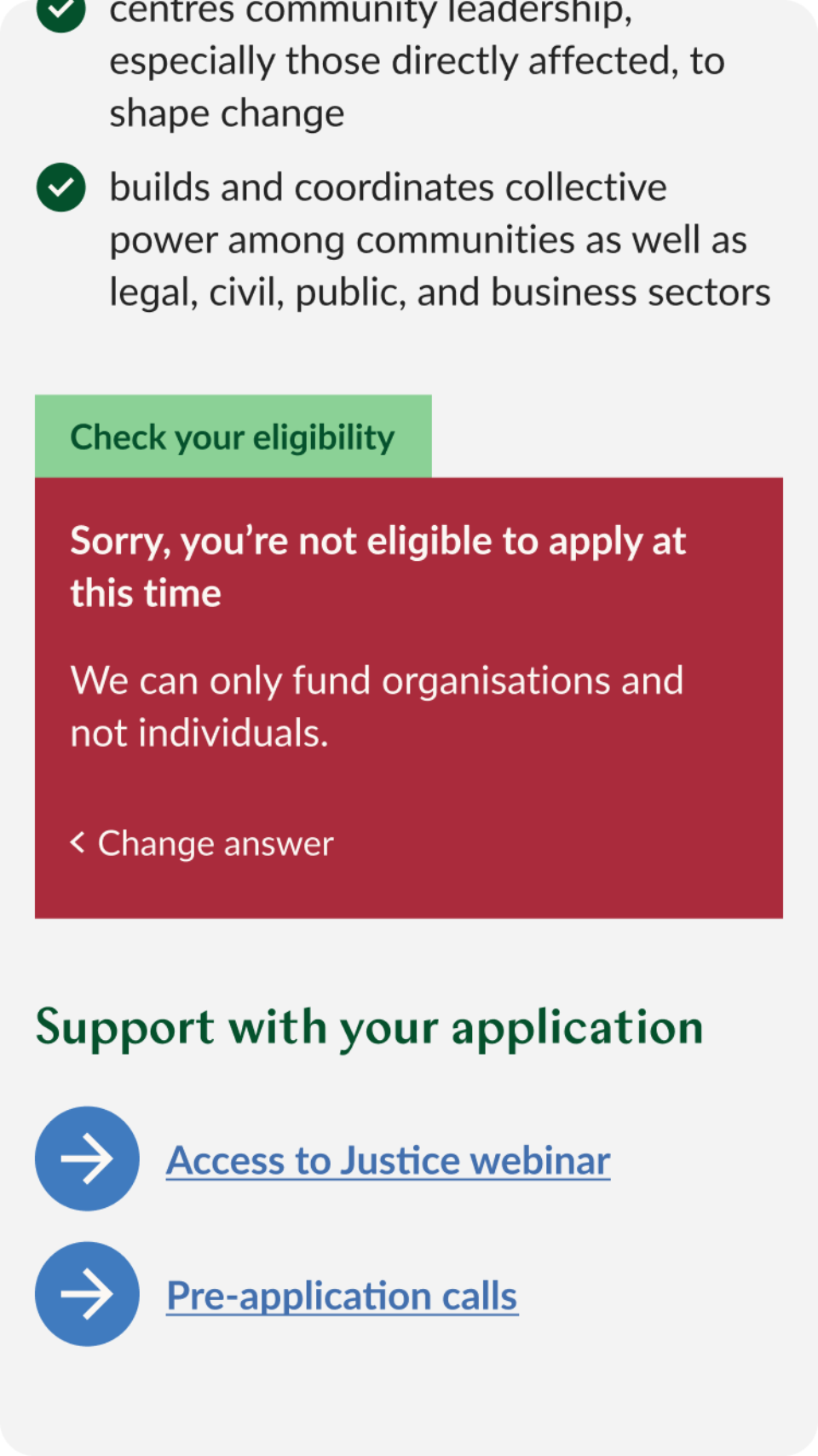 We created a new eligibility checker that gives quick responses based on City Bridge Foundation’s basic application criteria. If applicants are not eligible, they are provided with helpful, friendly feedback explaining why.